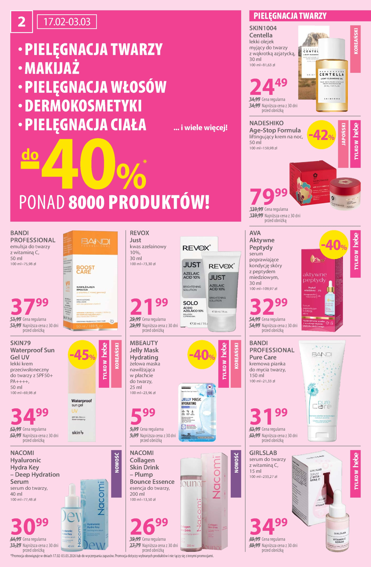 Zniżki w gazetce promocyjnej ograniczone są terminowo od wto 17. 02. 2026 do wto 3. 03. 2026. Zespół Kupino.pl codziennie aktualizuje dla Ciebie informacje o gazetkach promocyjnych Hebe - drogerie i innych sieci handlowych z całej Polski. Aktualnie znajdziesz na Kupino.pl 436 gazetek promocyjnych 159 sieci handlowych. Zaoszczędź czas i pieniądze, chroń środowisko, przeglądając gazetki na Kupino.pl i kupując produkty z gazetek promocyjnych Hebe - drogerie.